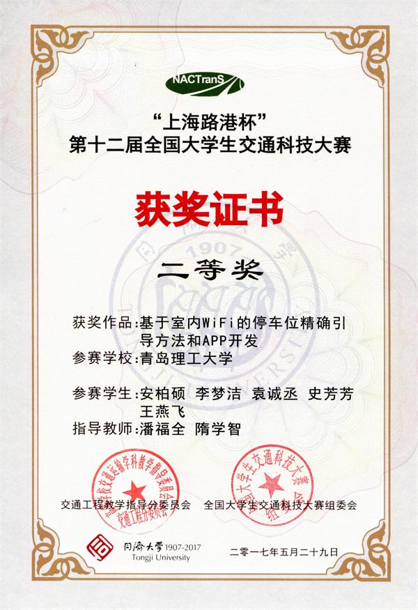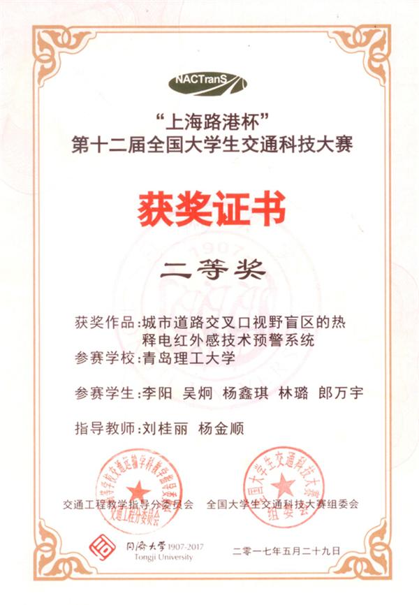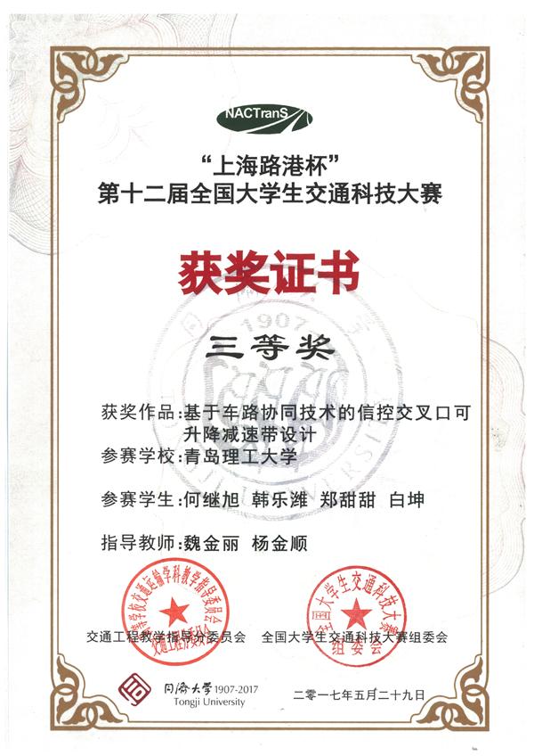 本届大赛共有全国120所高校报名,在初赛作品报送阶段,共有95所高校提交了302件作品;经过专家组匿名通讯评审,目前有来自51所高校的80件作品通过选拔进入决赛,我校三份作品进入决赛。参赛作品《基于室内wifi的停车位精确引导与APP开发》》(作者:安柏硕、王燕飞、李梦洁、袁诚丞、史芳芳 指导老师:潘福全 隋学智)及《城市道路交叉口视野盲区的热释电红外感技术预警系统》(作者:李阳 吴炯 杨鑫琪 林璐 郎万宇 指导老师:刘桂丽 杨金顺)在决赛中均取得了二等奖的优异成绩;《基于车路协同的信控交叉口可升降减速带设计》(作者:郑甜甜、何继旭、白坤、韩乐潍 指导老师:魏金丽 杨金顺)获得三等奖。
